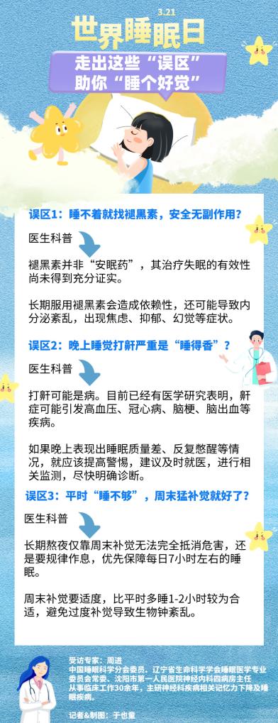新华社沈阳3月21日电(记者于也童)3月21日是世界睡眠日。睡眠大约占据了我们人生三分之一的时间,是健康的基石、生命的充电站。为了不失眠长期服用褪黑素、晚上睡觉打鼾却以为是“睡得香”、工作日睡眠不足一到周末猛补觉……这些不良的睡眠习惯,像“温水煮青蛙”一样,悄然侵蚀人们的身心健康。戳图↓听专家科普,走出这些“误区”,远离“困”扰。