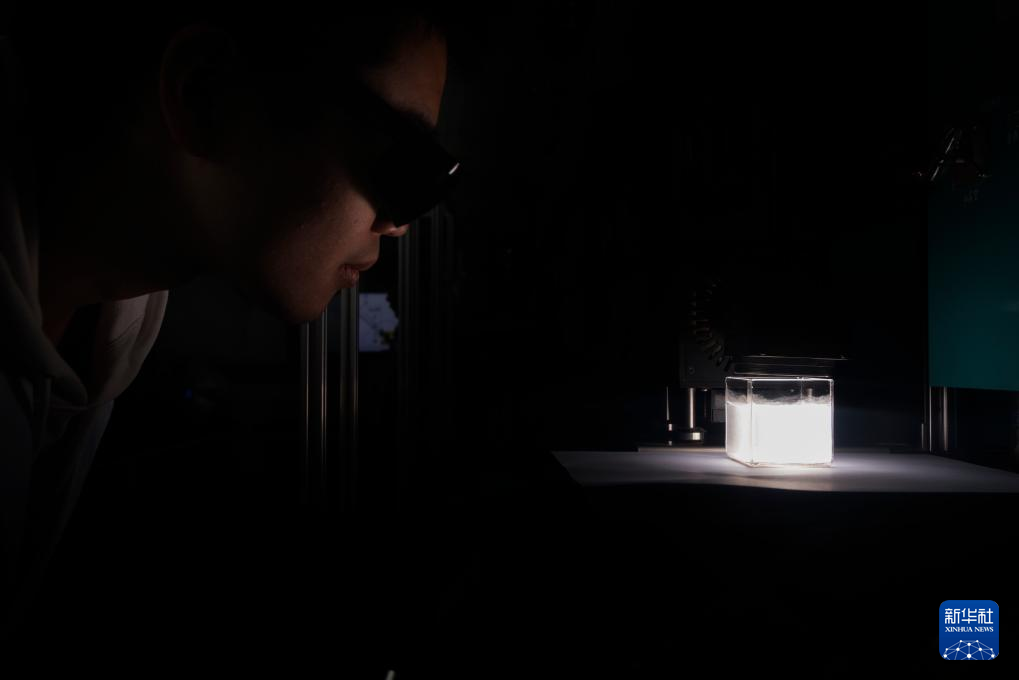 4月3日,在中国科学院金属研究所沈阳材料科学国家研究中心实验室,科研人员在观察光催化分解水制氢的实验进展。