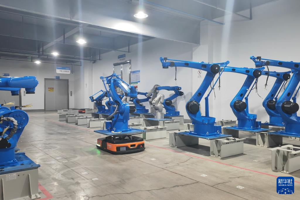 4月23日,成都卡诺普机器人技术股份有限公司生产车间,AGV机器人正转运生产下线的工业机器人。新华社记者李力可摄