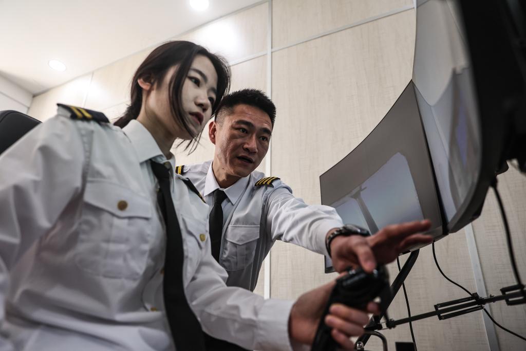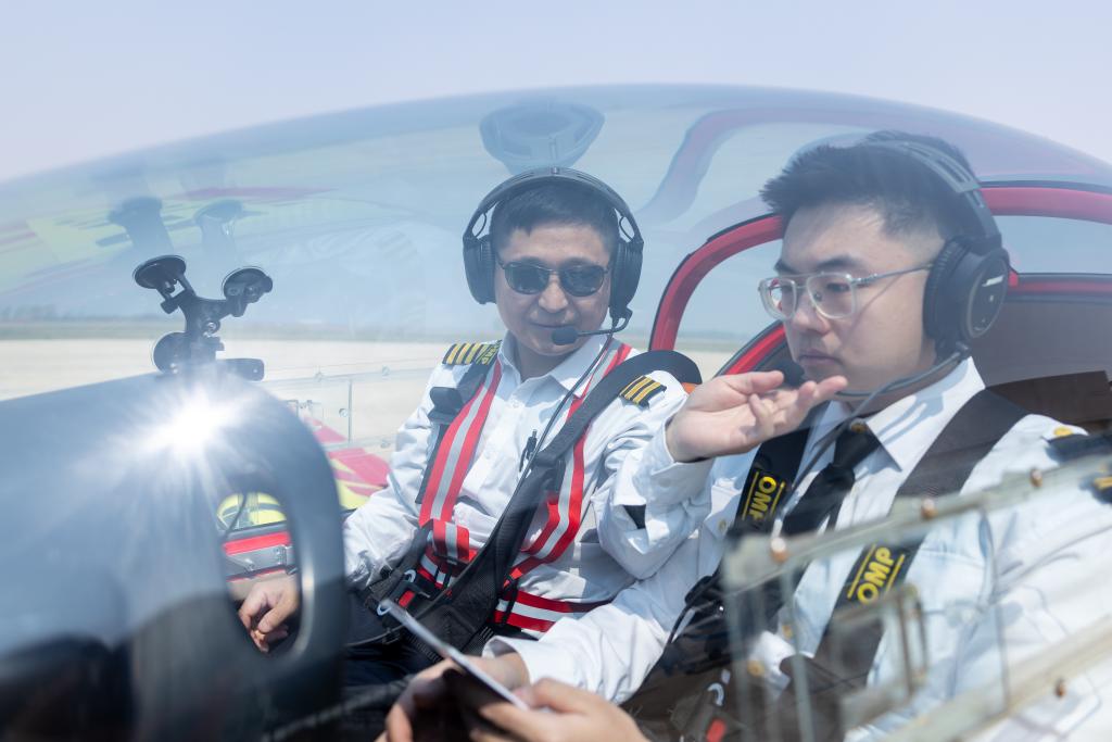 4月25日,在辽宁省沈阳市法库县,学员(左)在辽宁众智益昇航空飞行学院参加轻型运动飞机的飞行培训。