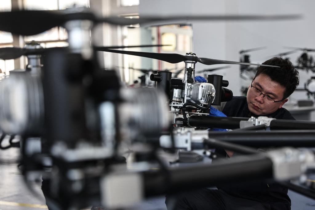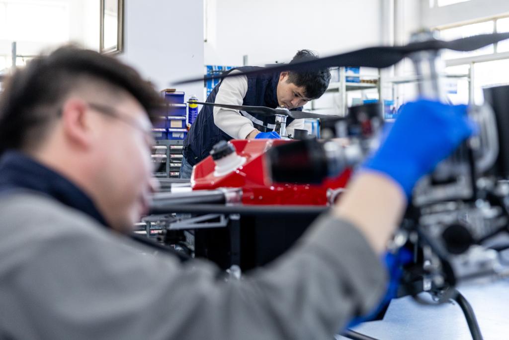 4月25日,在辽宁省沈阳市法库县,工程师在法库中军翼无人机科技有限公司的研发组装车间组装无人直升机。