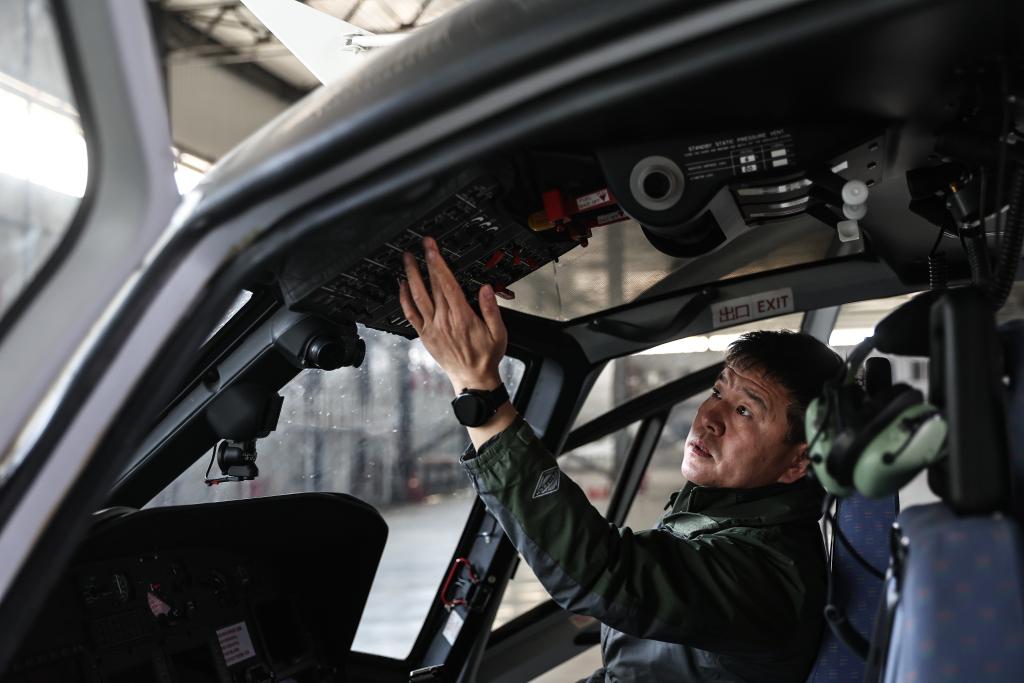 4月25日,在辽宁省沈阳市法库县,辽宁通飞通用航空有限公司负责人在机库对一架直升机进行例行检查,该直升机可应用于应急救援、航拍航测等场景。