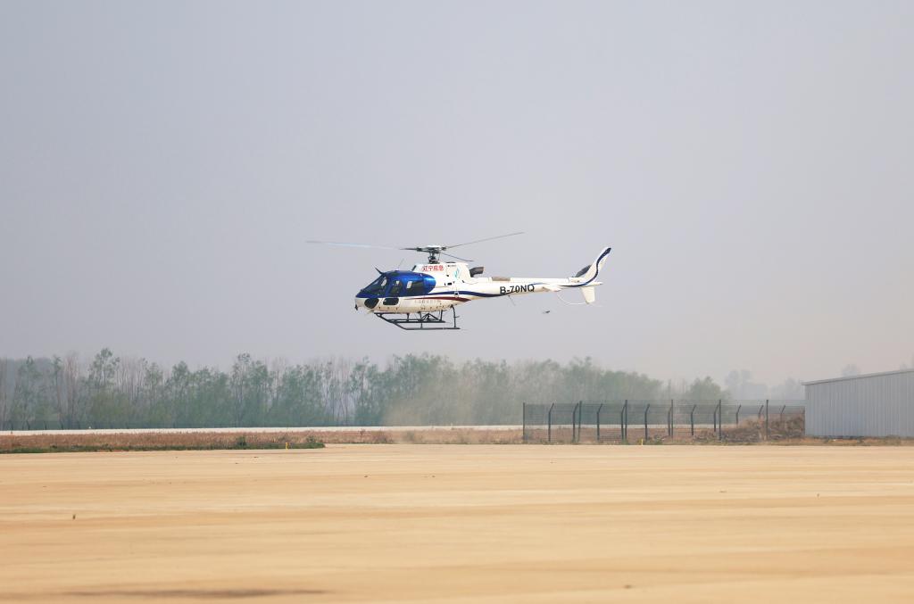 4月26日,在辽宁省沈阳市法库县,一架直升机从沈阳法库通用航空产业基地起飞,准备进行护林作业。