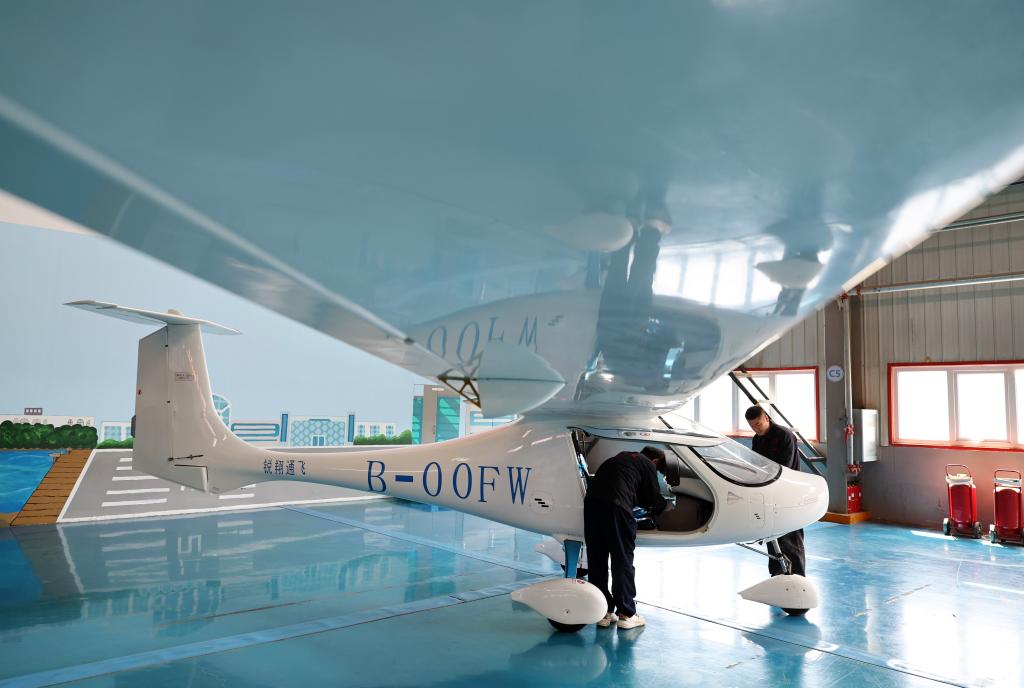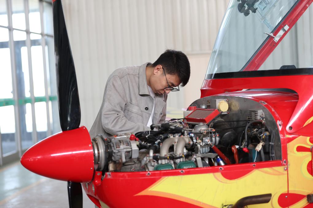 4月25日,在辽宁省沈阳市法库县,工程师在辽宁联航神燕飞机有限公司的生产线做航空器的日常维护。
