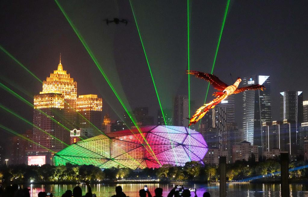 这是在沈阳市浑河上进行的“凤凰飞天”的无人飞行器表演(2024年10月7日摄)。
