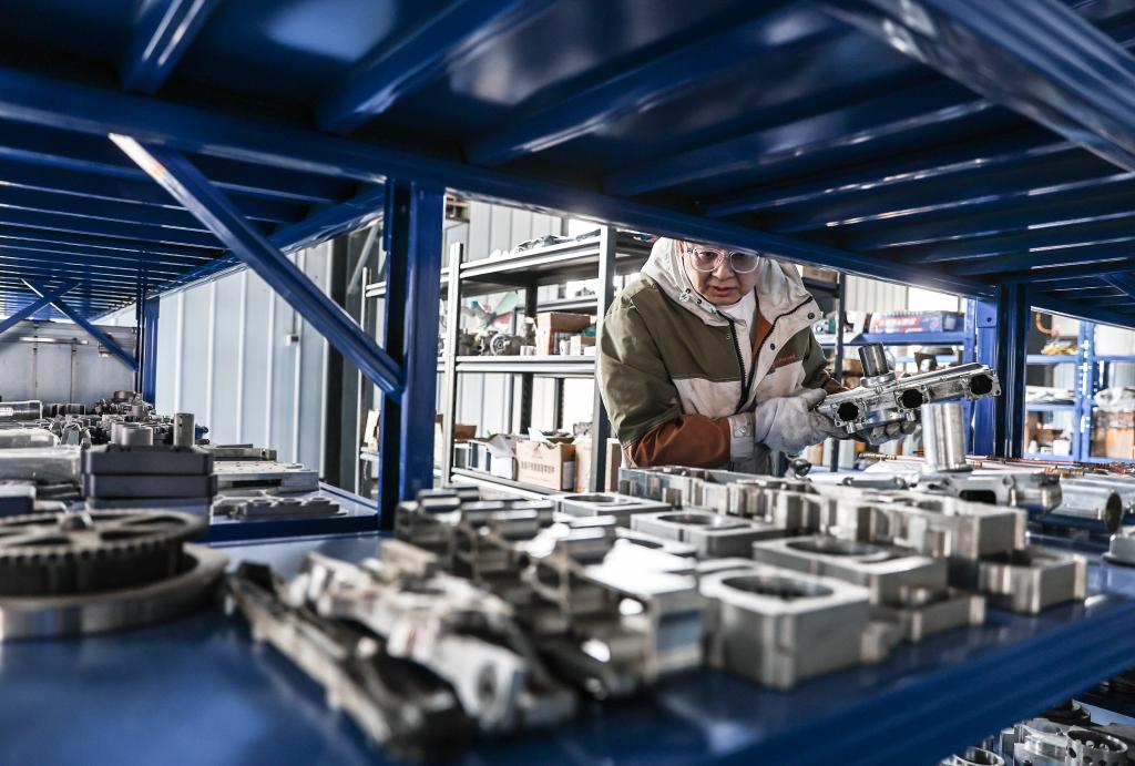 4月25日,在辽宁省沈阳市法库县,工程师在法库中军翼无人机科技有限公司的研发组装车间清点无人机配件。