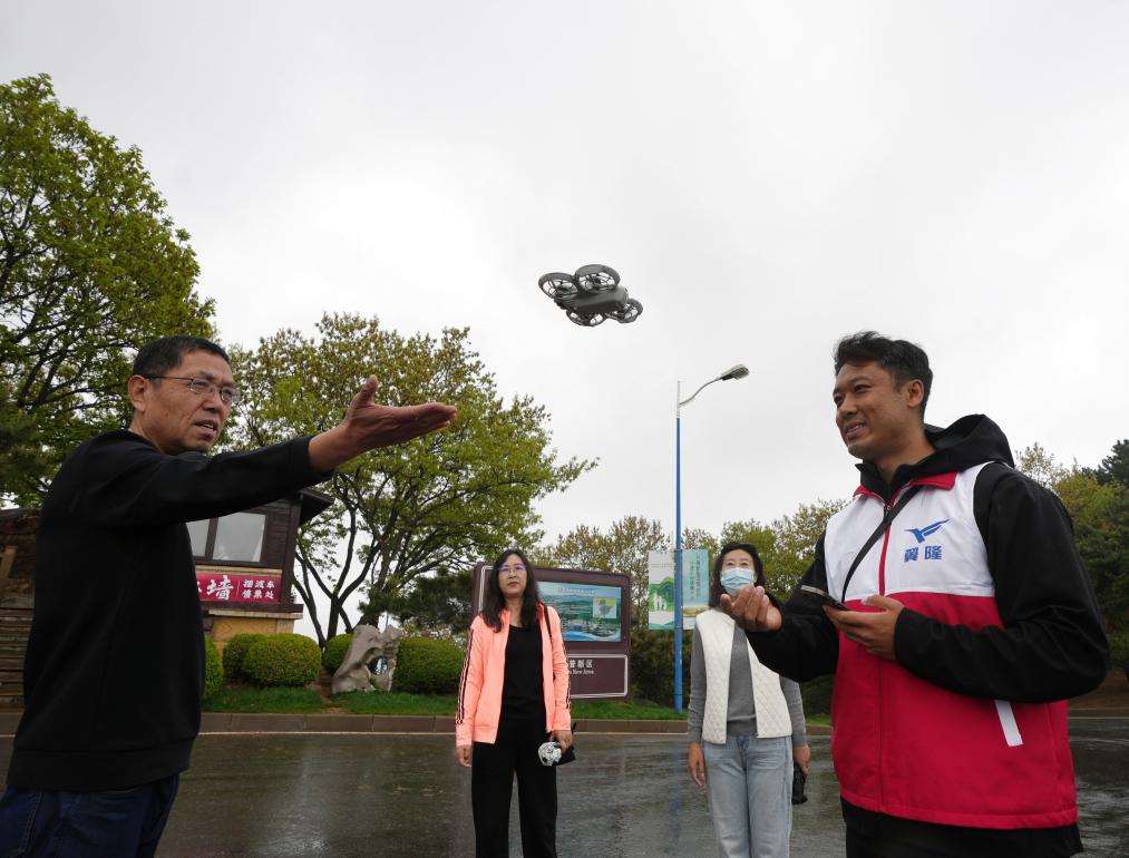 5月9日,在大连童牛岭风景区,辽宁翼隆通用航空有限公司的工作人员(右)帮助游客体验共享无人机。