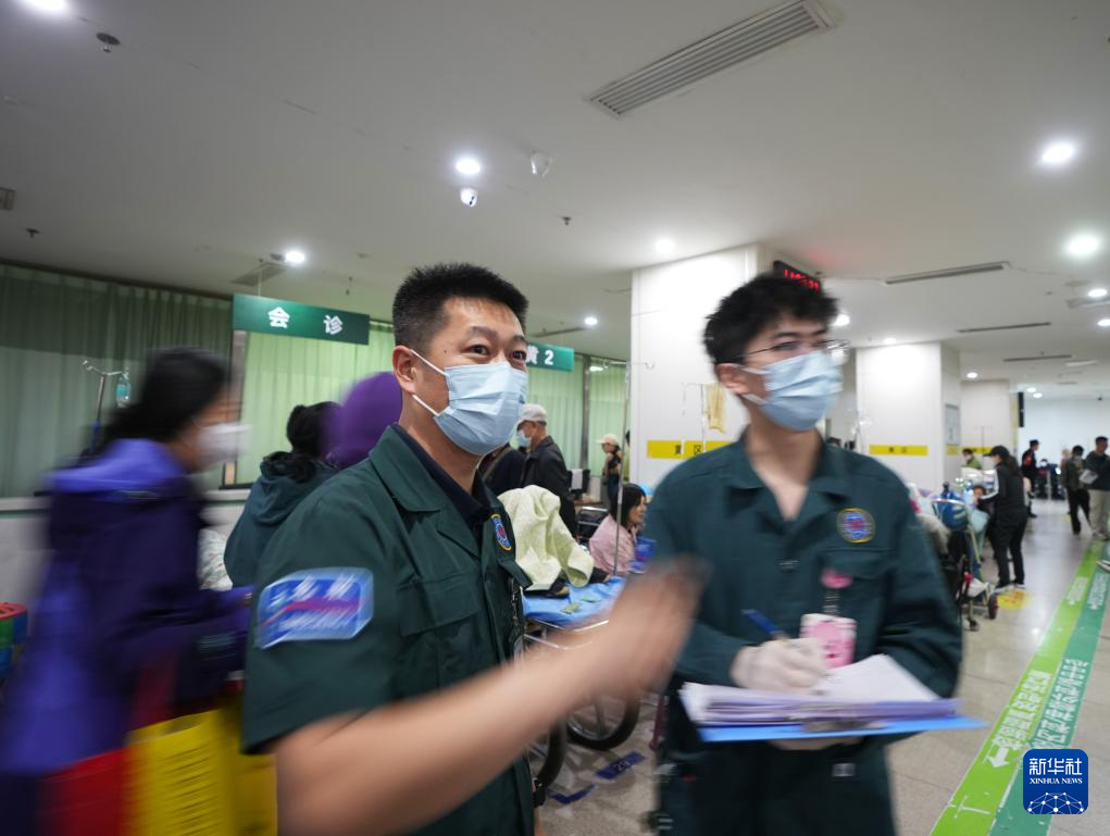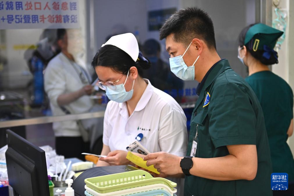 5月10日,护士长邵龙(右)接收新患者,并与120工作人员交接病人病情,准备为患者进行处置。