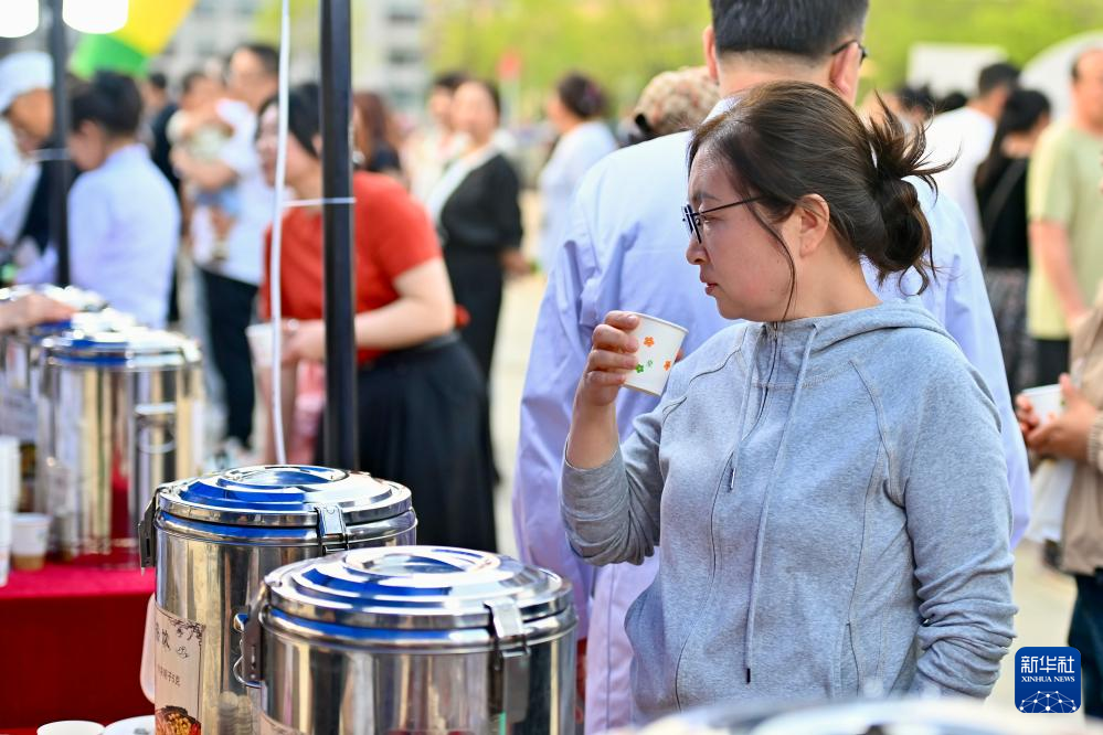 5月29日,在岫岩县中医药文化夜市现场,市民品尝中药茶饮。