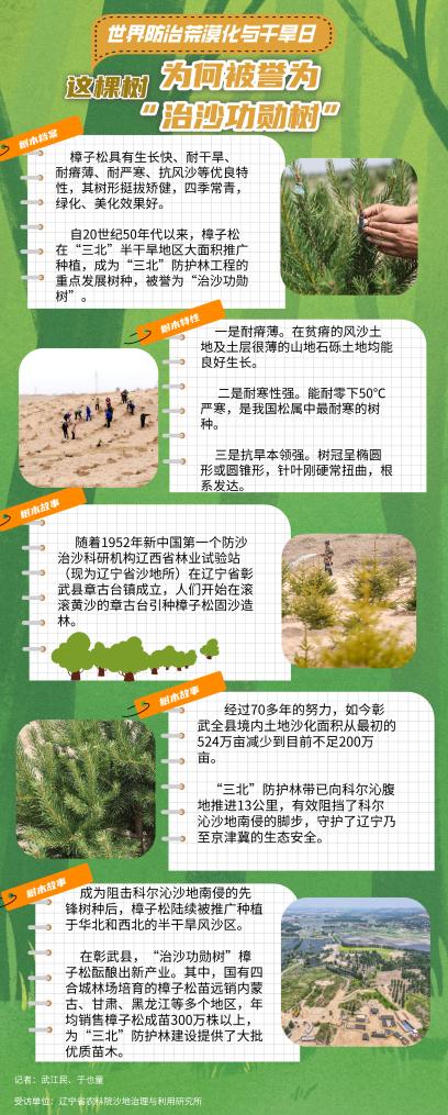 新华社沈阳6月17日电(记者于也童、武江民)在我国治沙史上,樟子松有着不可替代的地位,它有一个荣誉称号,“治沙功勋树”。到现在为止,樟子松仍是“三北”工程的重要树种之一。这棵树有何特殊?看图,翻开这份属于樟子松的“树木档案”。