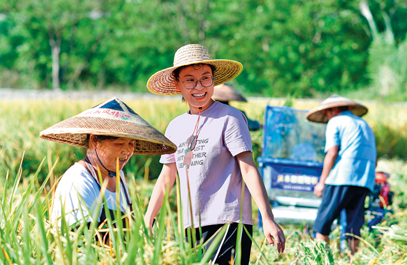 贵州省岑巩县注溪镇周坪村党支部副书记侯佳媛(左二)在帮助村民收割杂交水稻(2024 年 9 月 27 日摄)杨文斌摄 / 本刊