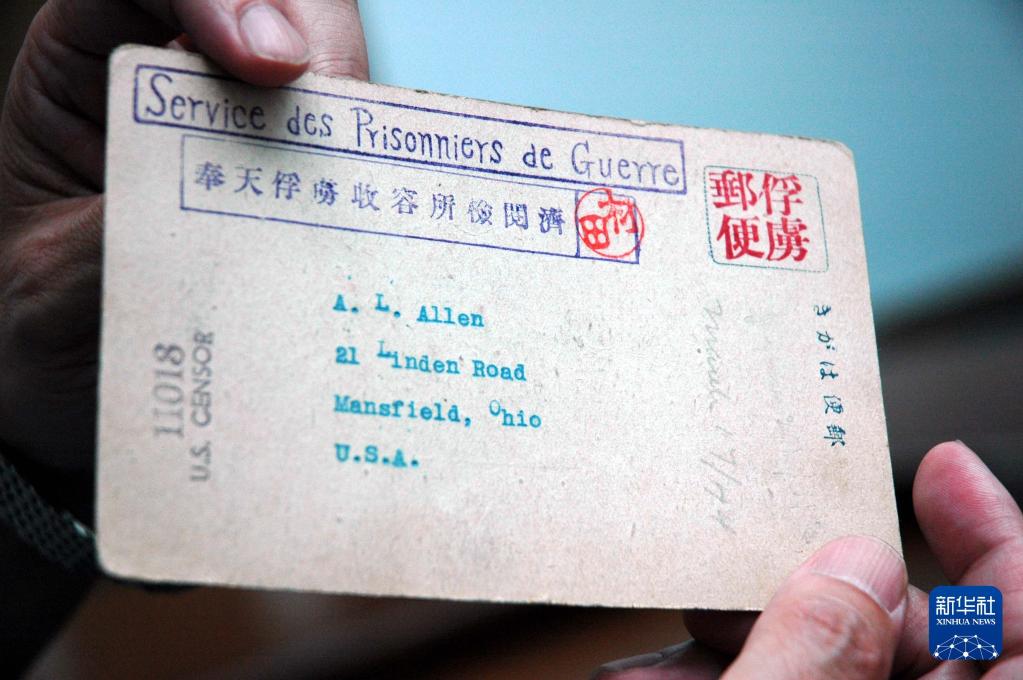 这是当年战俘们寄给亲友的实寄明信片(2008年7月31日摄)。64开的明信片上有“俘虏邮便”“奉天俘虏收容所检阅济”的明显印记,这些私人信件当年要经过日军的严格审查,盖上战俘营司令官松田的名章后才能寄出。2008年7月31日,200余件二战时期美国老兵珍藏的文物史料,被捐赠给沈阳二战时期盟军战俘营旧址纪念馆。