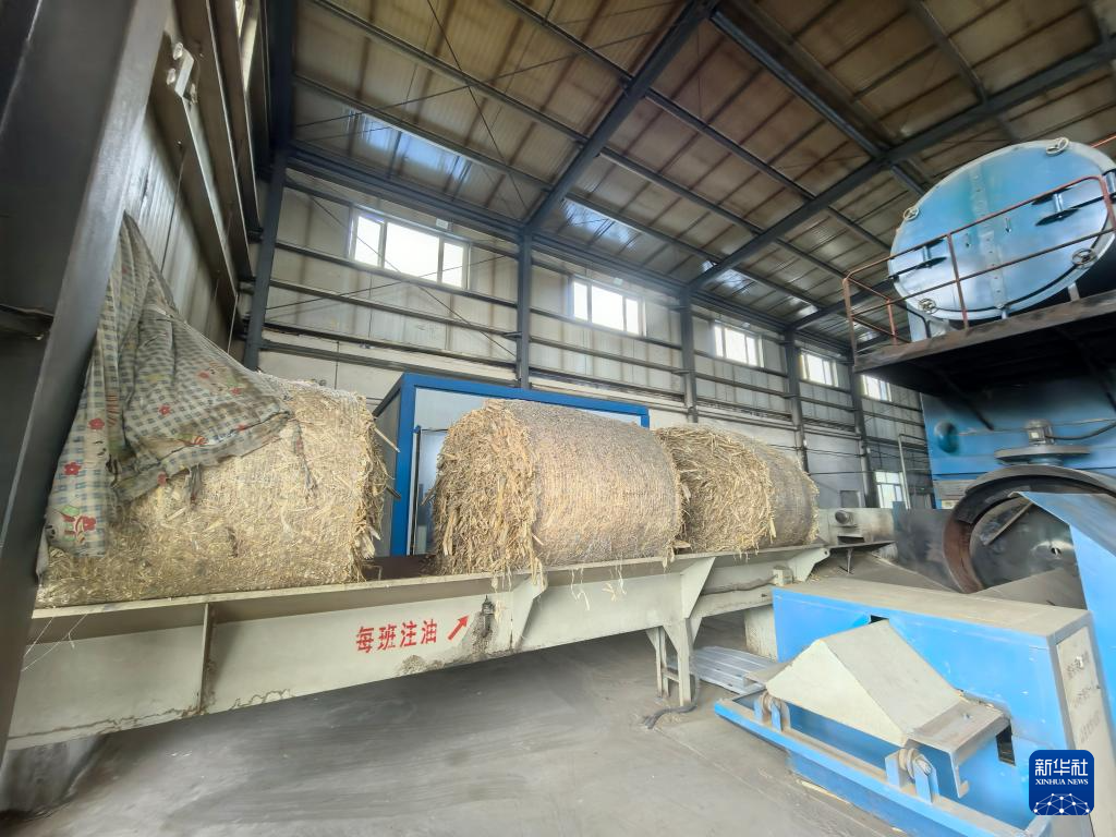 2025年7月25日在辽宁省阜新蒙古族自治县查干哈达村附近一家生物质燃料供热企业内拍摄的秸秆包。新华社记者 武江民 摄