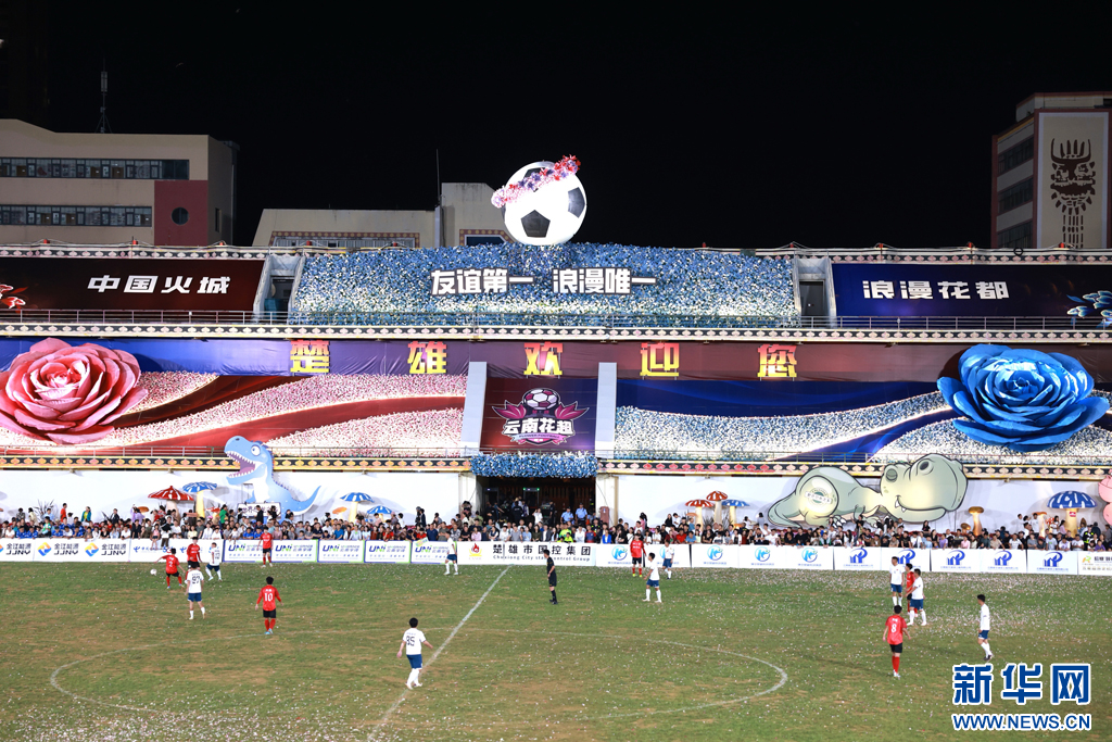 7月12日,2025村超全国赛暨云南鲜花足球超级联赛在楚雄州体育场激情开赛,体育场装扮了马缨花,助威声伴随着芦笙舞,这个以花卉为主题的足球联赛,向世界展示了云南多民族融合的底蕴和现代体育赛事的发展。