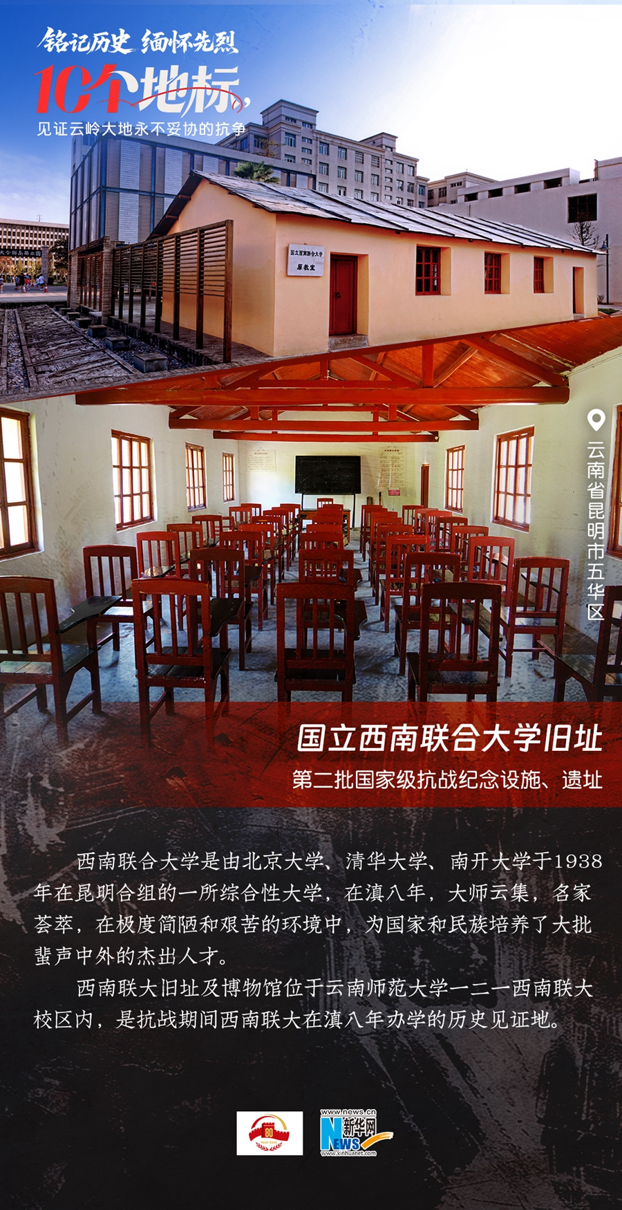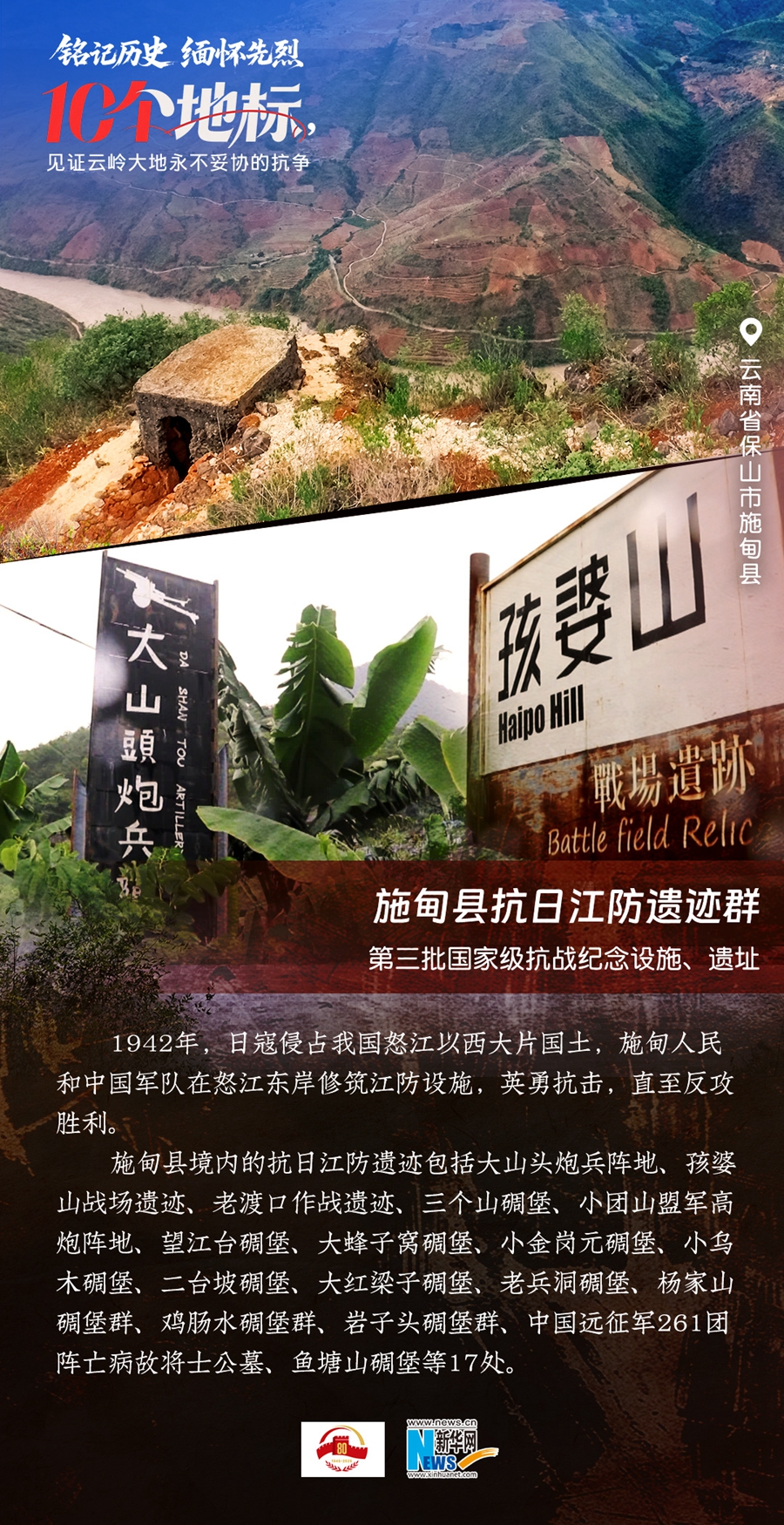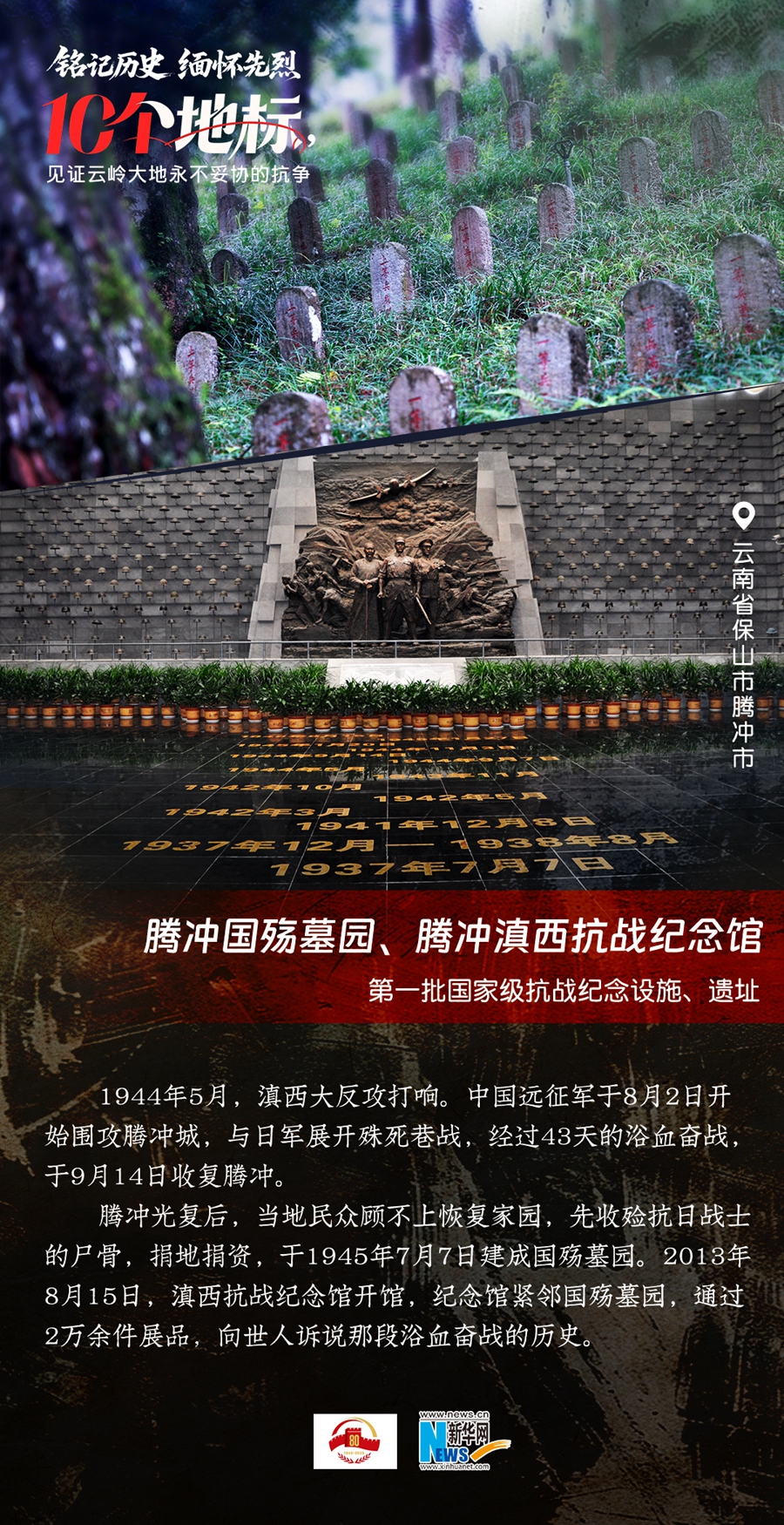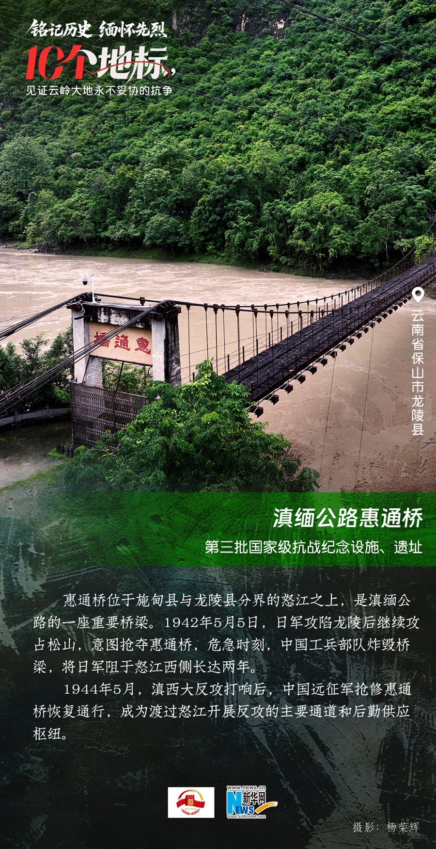 80年过去,曾经的战场硝烟虽散,但英气永存。在国务院公布的前三批国家级抗战纪念设施、遗址名录中,云南省共有10个,分别为腾冲国殇墓园、腾冲滇西抗战纪念馆,龙陵抗日战争纪念馆,国立西南联合大学旧址,抗战胜利纪念堂,松山战役旧址,南洋华侨机工回国抗日纪念碑,怒江驼峰航线纪念馆,施甸县抗日江防遗迹群,滇缅公路惠通桥,滇西抗日战争纪念碑。它们承载着国人共同的历史记忆与民族情感,也为我们学习和传承抗战精神提供了现实条件。