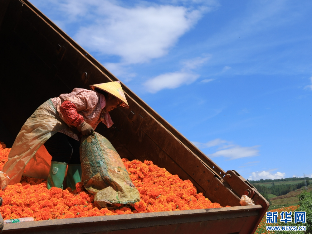 8月6日,在云南省腾冲市明光镇凤凰山,花农将采摘的万寿菊装车。新华网发(龚祖金 摄)
