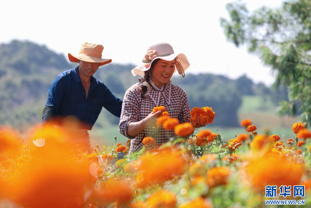 8月6日,在云南省红河哈尼族彝族自治州开远市灵泉街道洒红口村,花农正在采收万寿菊。新华网发(陶家淇 摄)