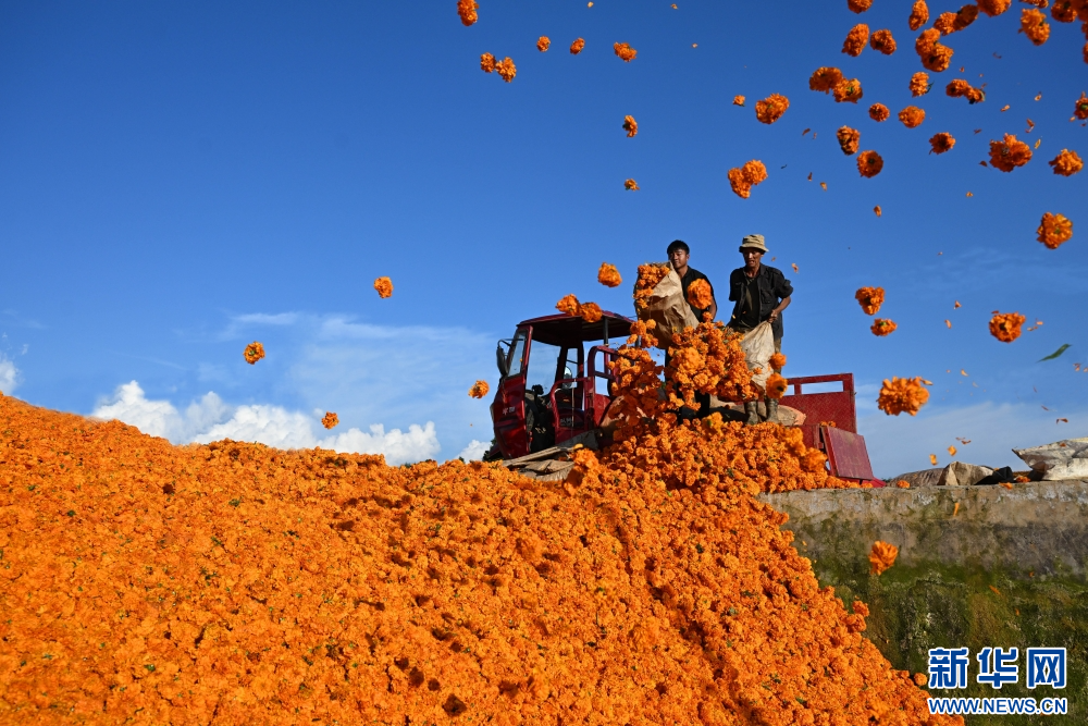 8月7日,在云南省腾冲市固东镇,花农将采摘的万寿菊装车。新华网发(龚祖金 摄)