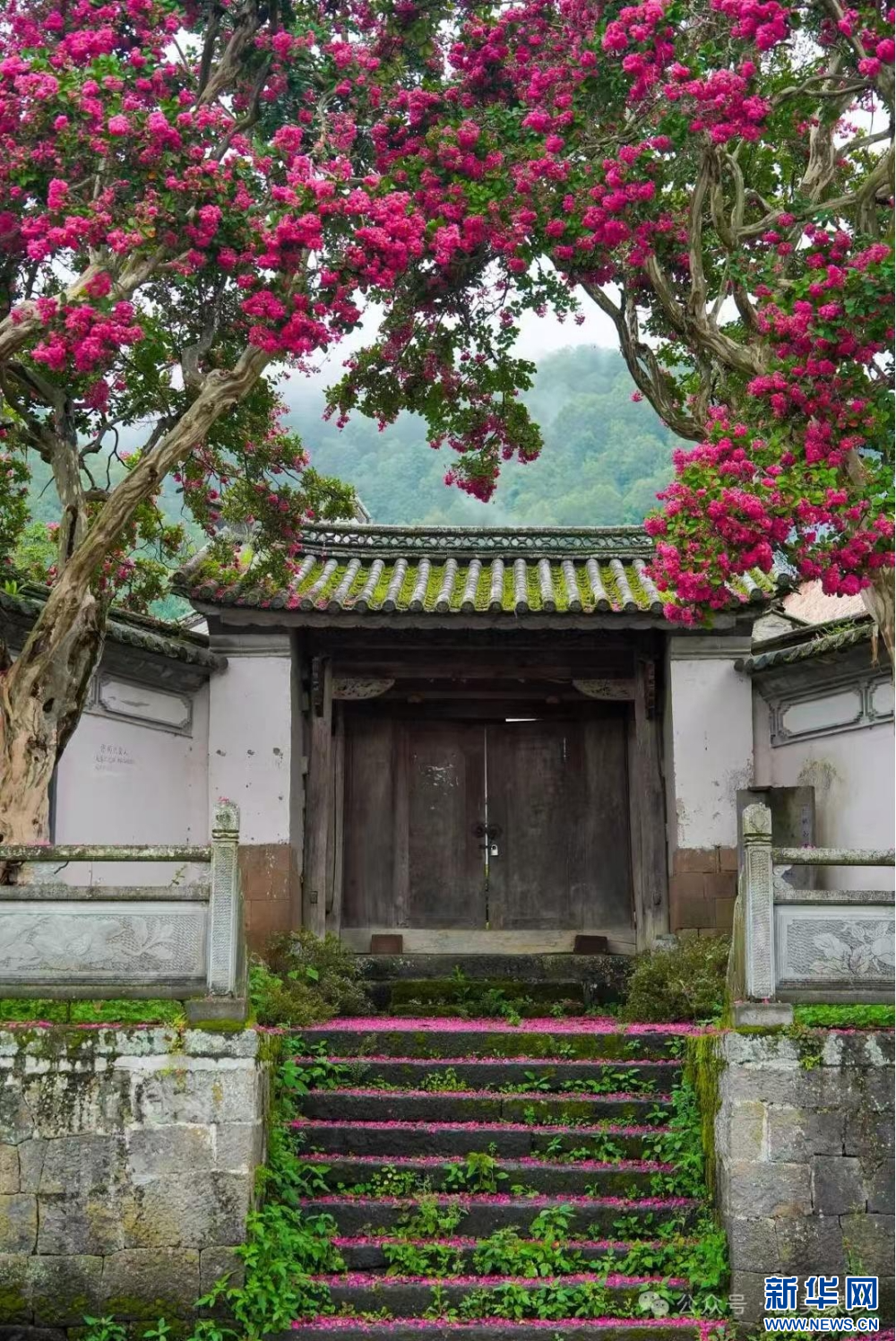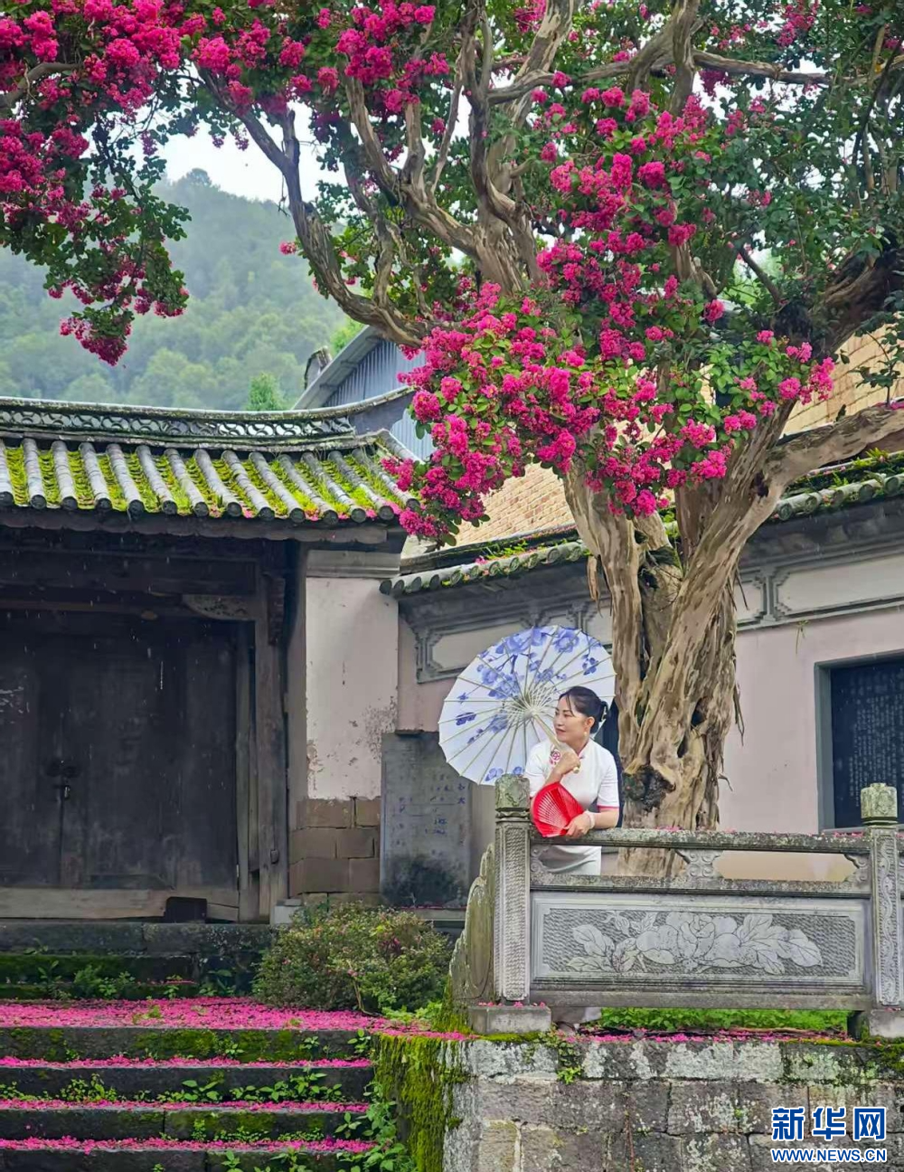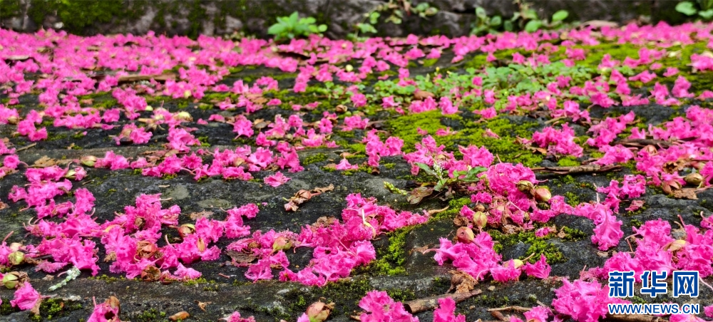 近日,在云南省腾冲市玉壁村,紫薇花开正艳,花朵被雨打落在地面上,更显雅致,吸引游人观赏、拍照。新华网发(赵辉 摄)