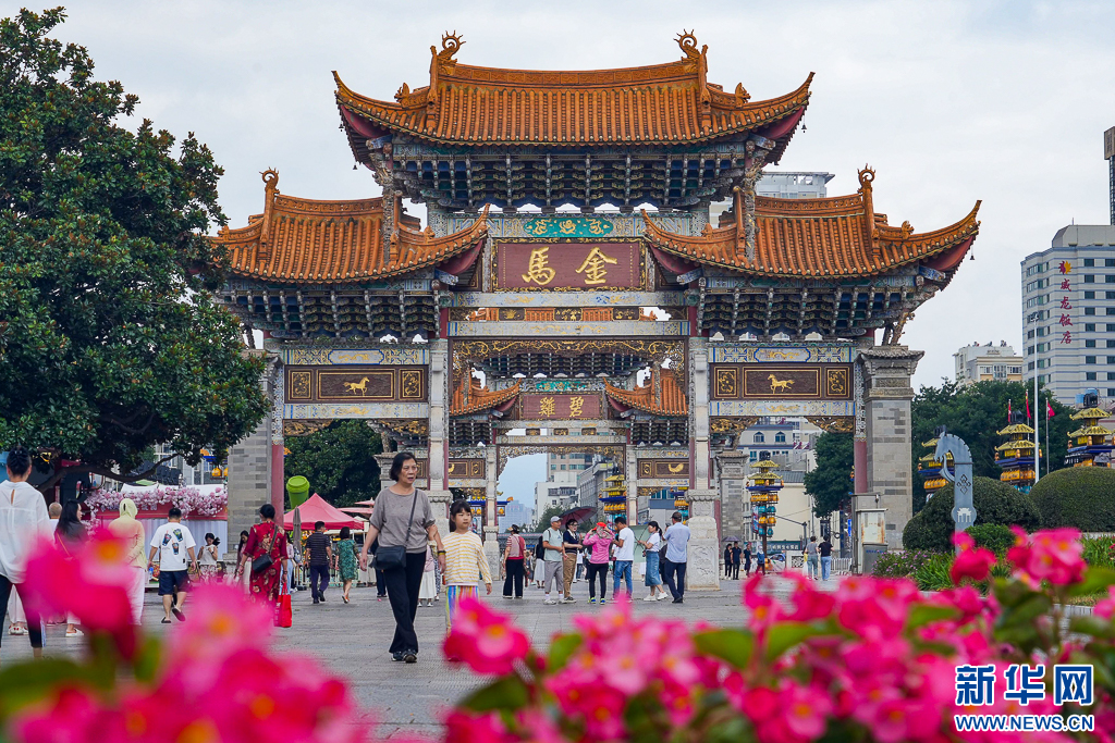 游客在金马碧鸡坊游玩(8月10日摄)。新华网发(郑益 摄)