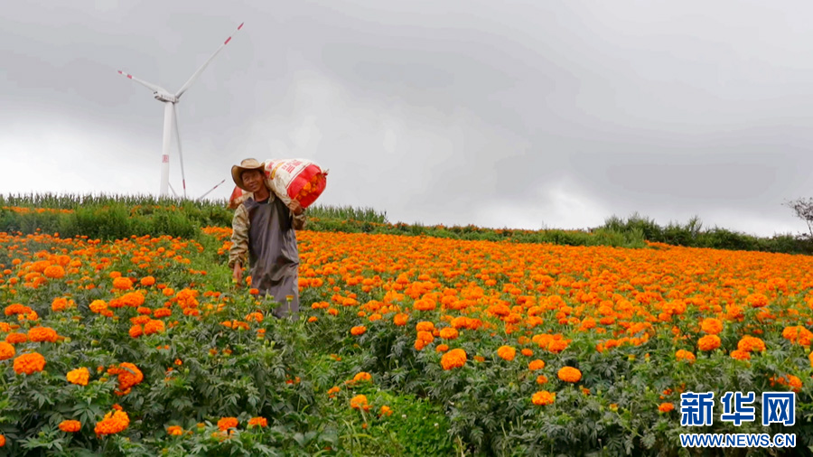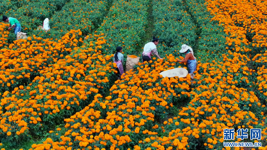 农户采摘万寿菊(8月14日摄)。新华网发(张天宇 摄)