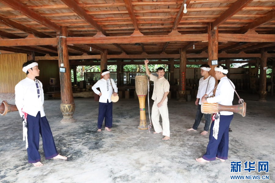 8月16日,波罕丙(左三)为徒弟们讲解象脚鼓舞要领。新华网发(李云生 摄)