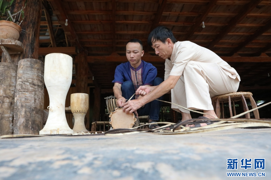8月16日,波罕丙(右)与儿子岩罕丙一同制作象脚鼓。新华网发(李云生 摄)