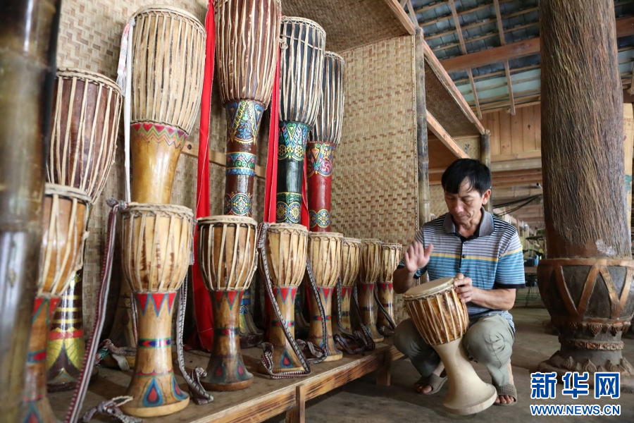 8月16日,波罕丙查看象脚鼓。新华网发(李云生 摄)