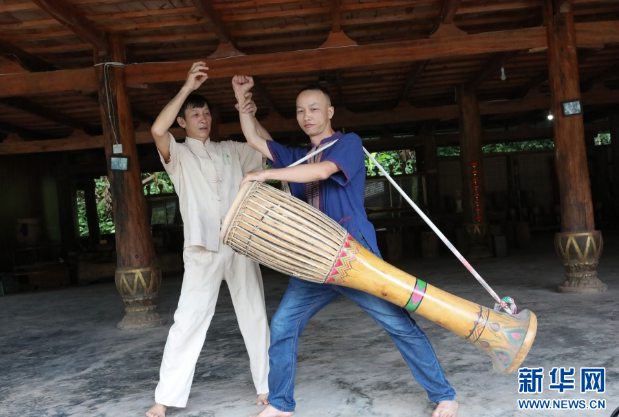8月16日,波罕丙(右一)带领徒弟练习象脚鼓舞。新华网发(李云生 摄)