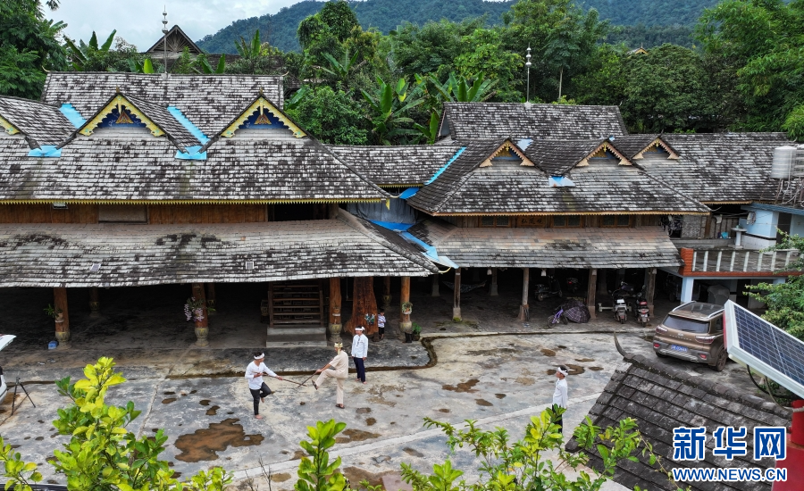 8月16日,波罕丙带领徒弟们练习傣族武术(无人机照片)。新华网发(李云生 摄)