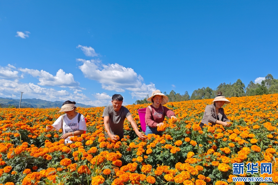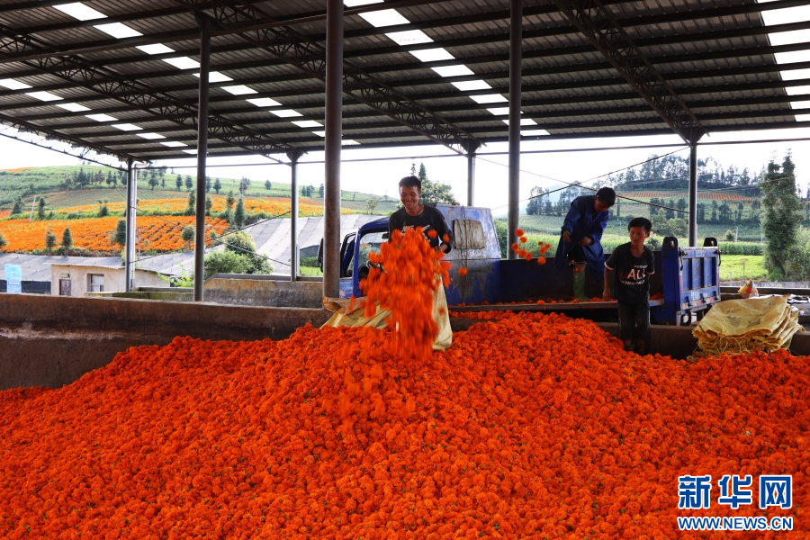 万寿菊丰收(8月19日摄)。新华网发(伍明欢 摄)