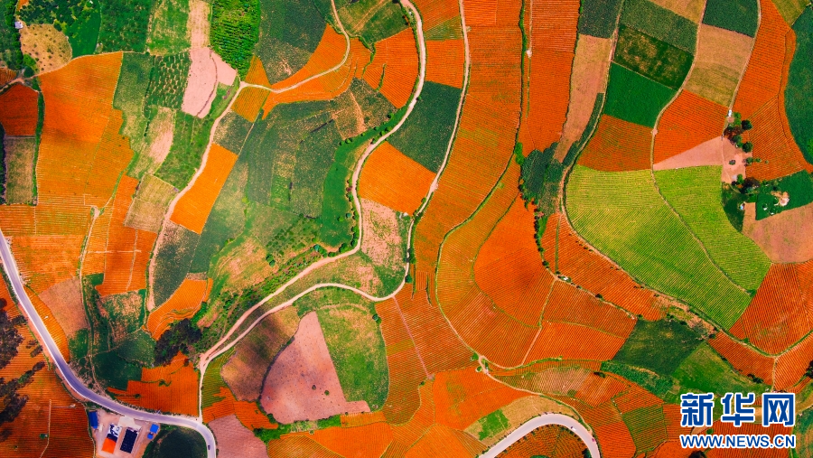 高空俯瞰万寿菊花田(8月19日摄)。新华网发(李伟健 摄)