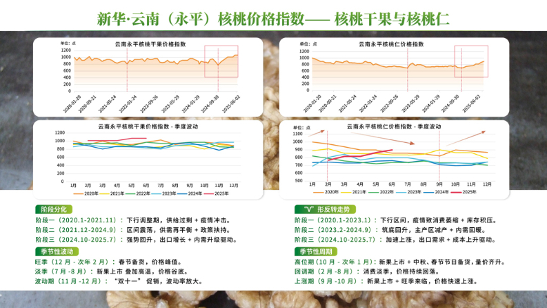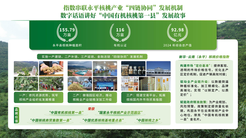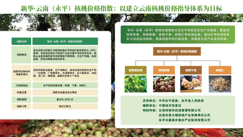 8月22日,由中国经济信息社与云南省大理白族自治州永平县人民政府联合打造的“新华・云南(永平)核桃价格指数2025”,在云南昆明正式发布。指数覆盖核桃青皮果、鲜果、干果、核桃仁四大品类,采集杉阳镇、厂街彝族乡等8个主产地交易数据,形成动态监测体系,为相关产业政策的制定提供精准数据支撑,为全国高原特色产业的数字化发展提供宝贵经验。
