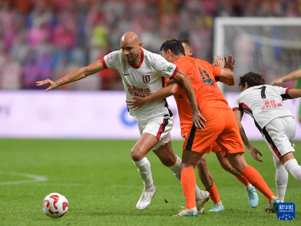 8月23日,云南玉昆队球员奥斯卡(右)与成都蓉城队球员李扬(左)在比赛中拼抢。新华社记者 陈欣波 摄