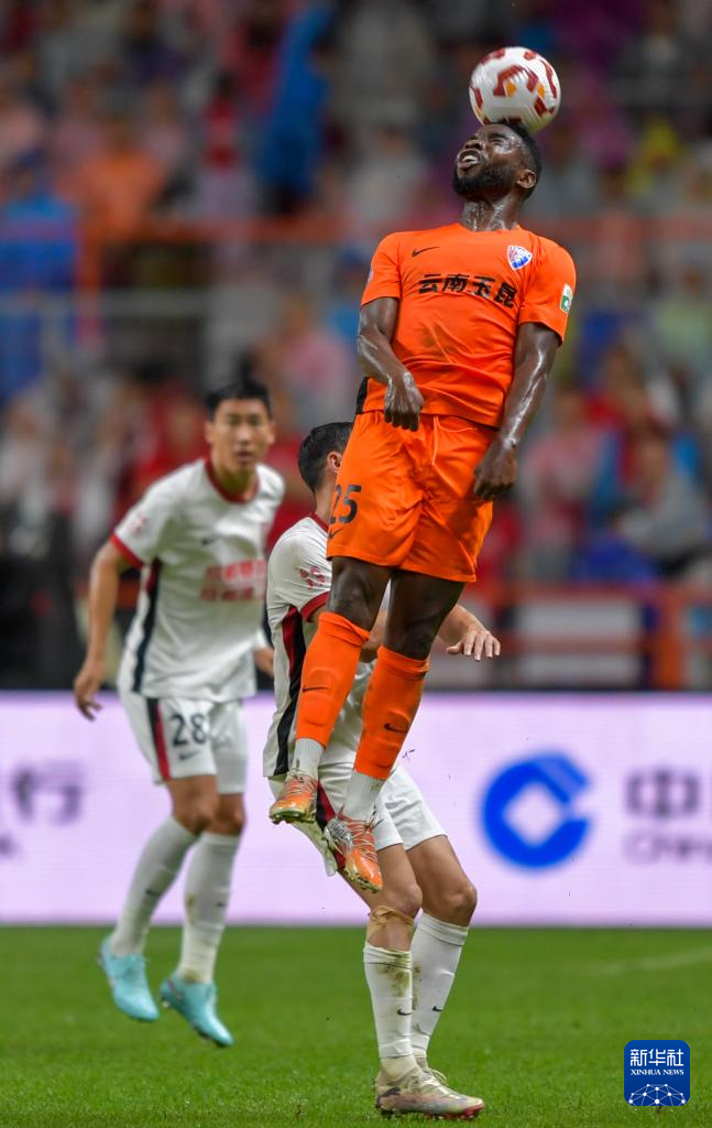 8月23日,云南玉昆队球员奥斯卡(上)在比赛中争顶。新华社记者 陈欣波 摄