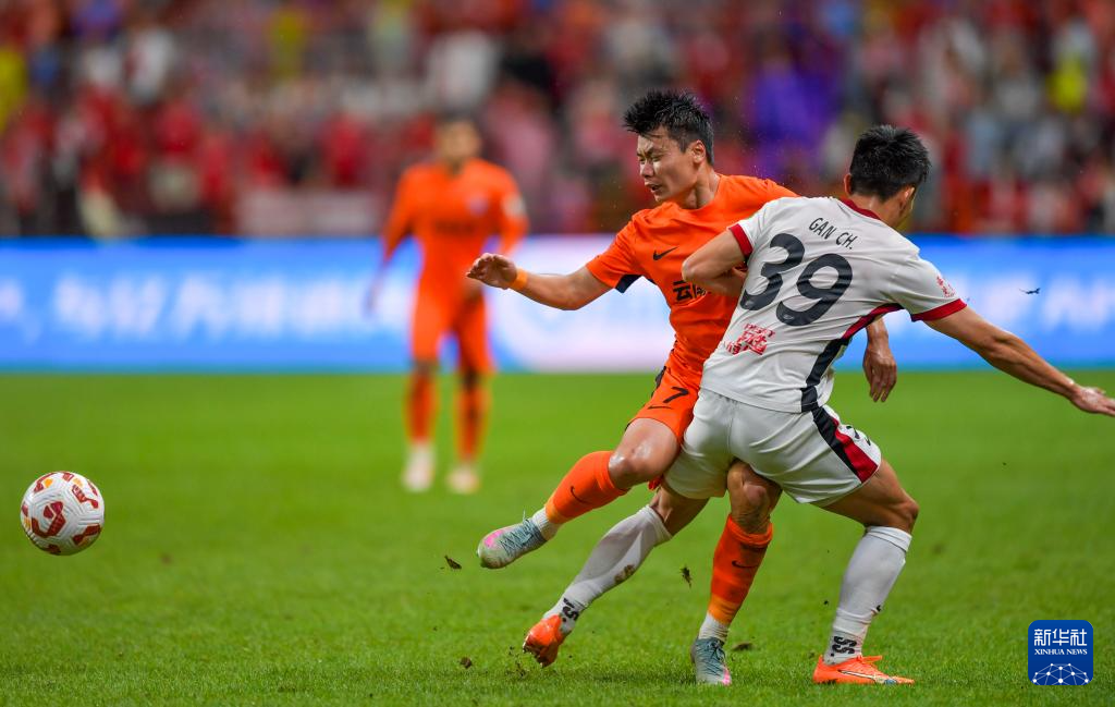 8月23日,云南玉昆队球员罗竞(中)与成都蓉城球员队甘超(右)在比赛中拼抢。新华社记者 陈欣波 摄