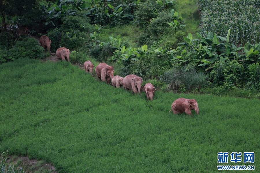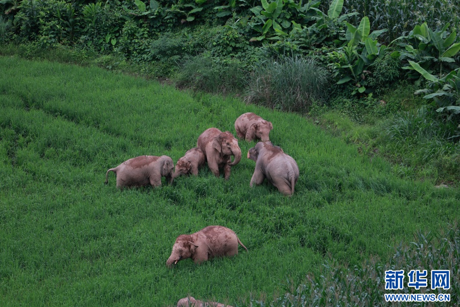 正在觅食的野生亚洲象群(7月7日摄)。新华网发(徐华陵 摄)