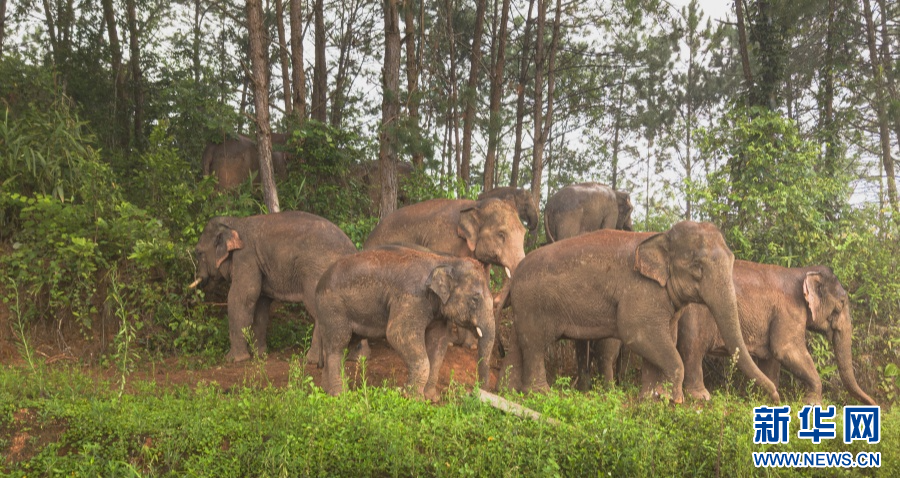 野生亚洲象群在雨中活动(7月1日摄)。新华网发(周晨浩 摄)