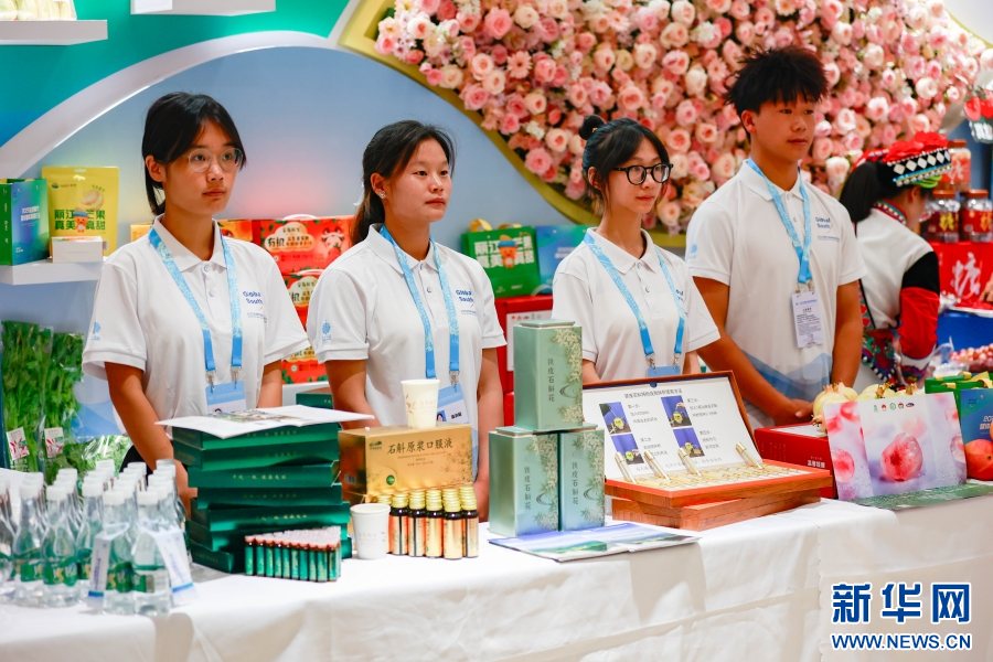 2025全球南方媒体智库高端论坛开幕式会场展台处,志愿者提供周到服务(9月6日摄)。新华网发(刘云 摄)