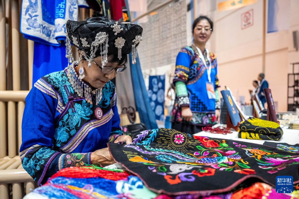9月17日,国家级非物质文化遗产彝族(撒尼)刺绣省级代表性传承人游定美在创意云南文化产业博览会上刺绣。新华社记者 胡超 摄