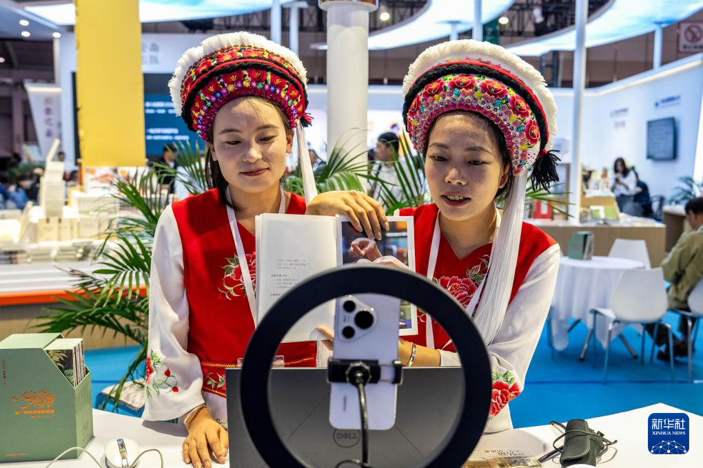 9月17日,参展商在创意云南文化产业博览会上直播推介云南特色书籍。新华社记者 胡超 摄