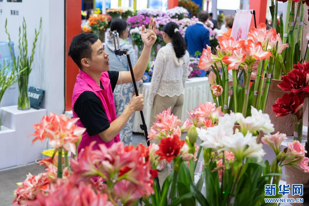 9月19日,参展商在第二十三届中国昆明国际花卉展直播推介花卉。新华社记者 高咏薇 摄