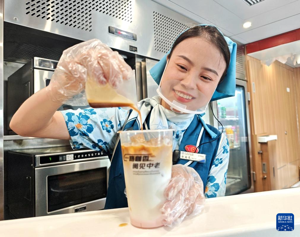 9月20日,工作人员在中老铁路列车上制作玫瑰特调咖啡。新华社记者 邢广利 摄