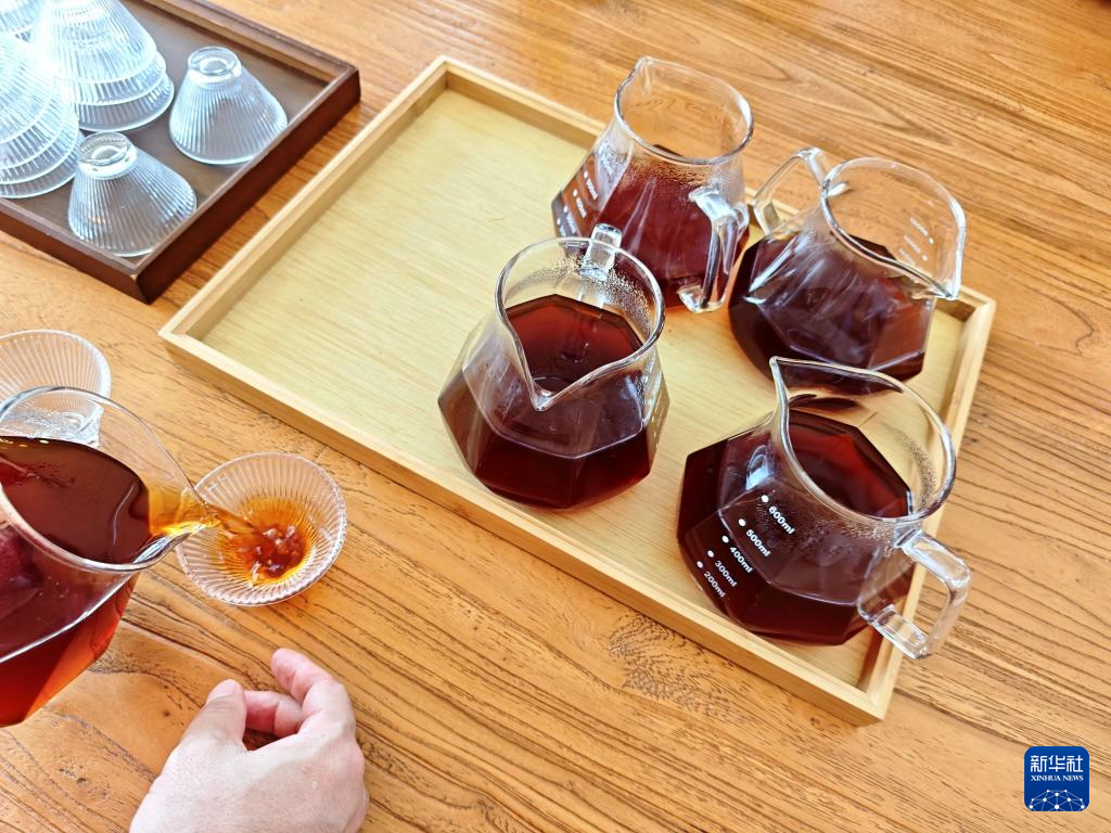 这是普洱市思茅区南屏镇南岛河村白沙坡小组的“美丽星村·有风咖谷”的咖啡师制作的咖啡(9月20日摄)。新华社记者 邢广利 摄