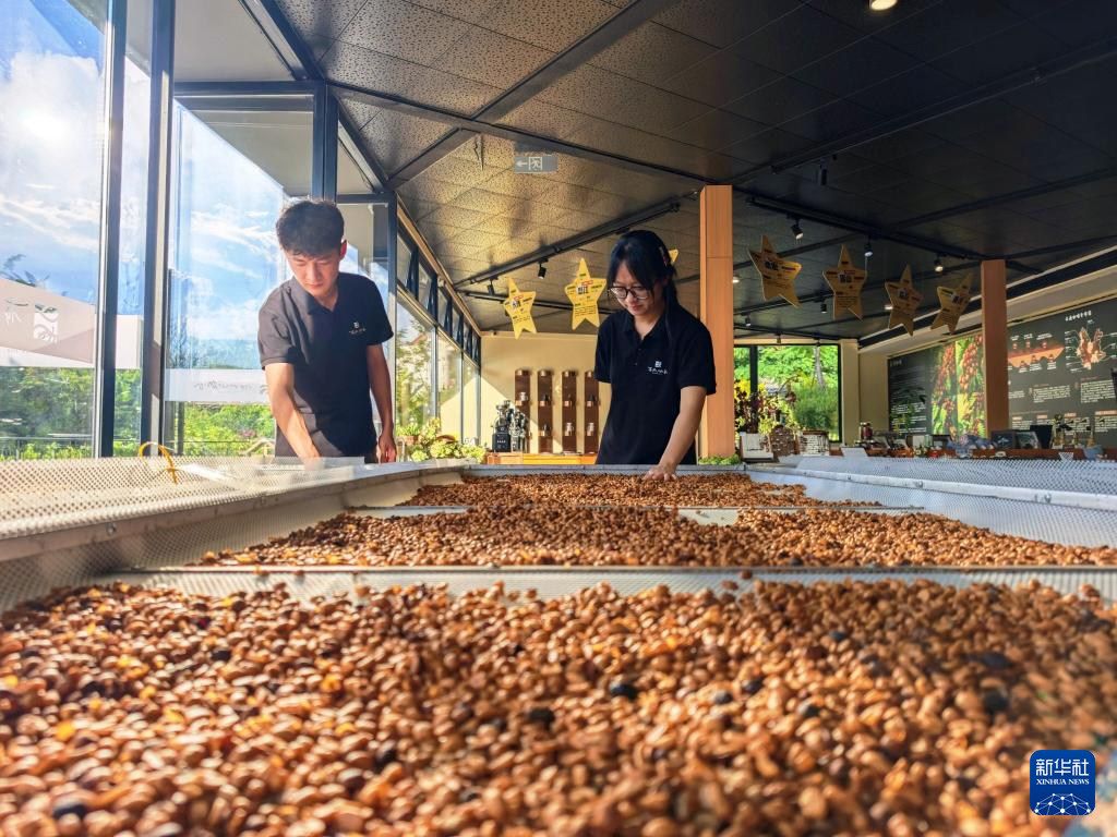 9月20日,普洱市思茅区南屏镇南岛河村白沙坡小组的“美丽星村·有风咖谷”工作人员在展示咖啡豆的处理过程。新华社记者 邢广利 摄