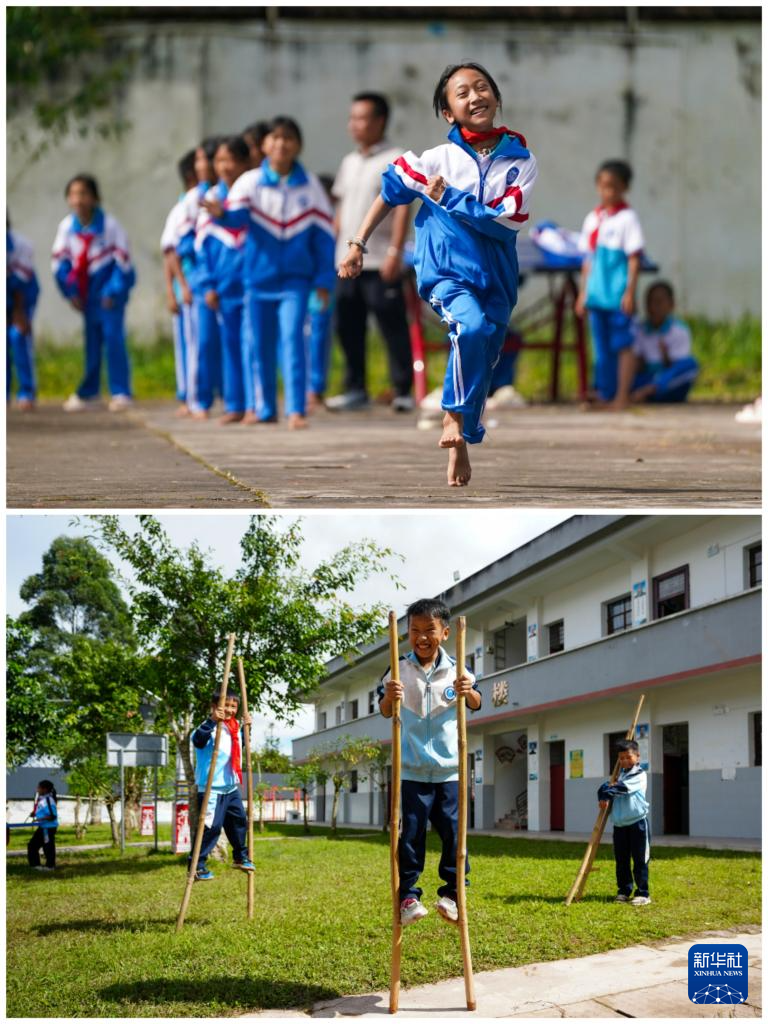 课后,腊福小学的孩子在接力(上)。戈的小学的孩子在踩高跷(下)。新华社记者陈欣波 摄