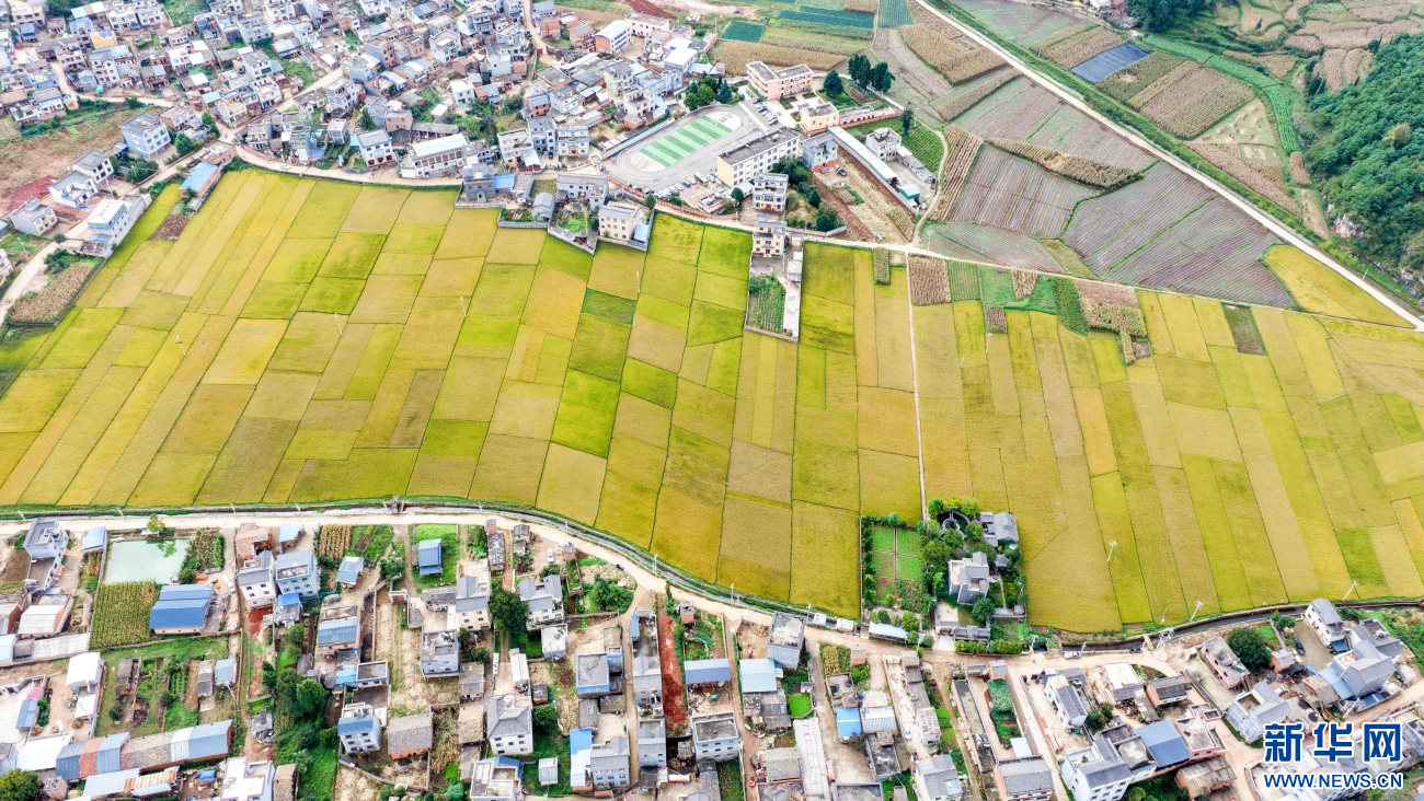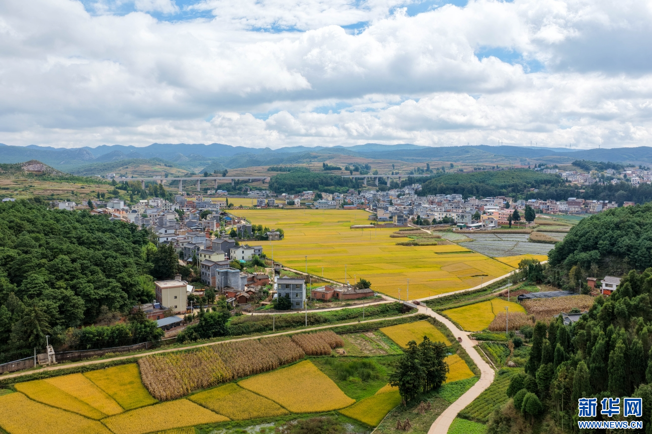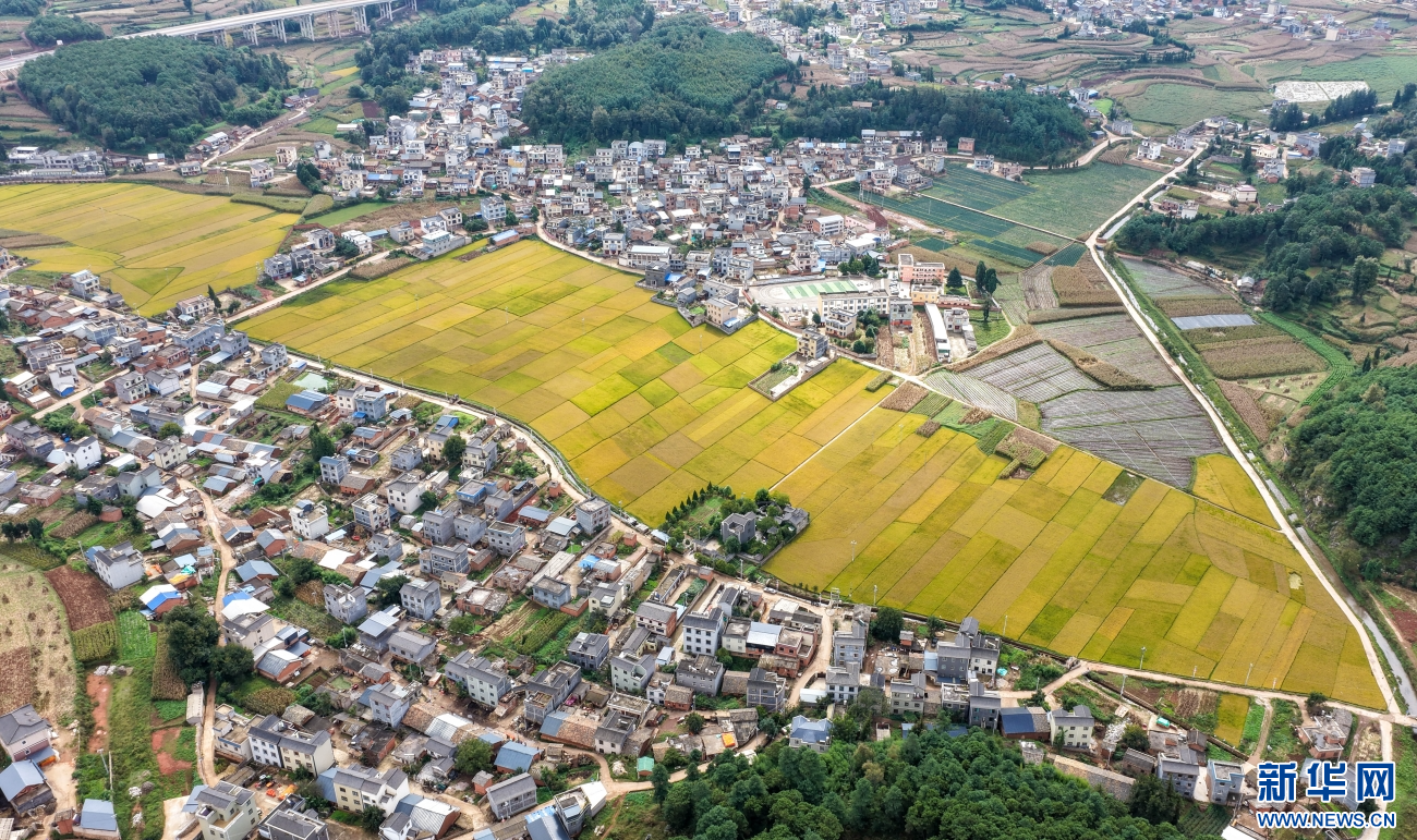 金秋时节,云南省曲靖市沾益区播乐乡乐利村“丰”景如画。在秋日大地的“调色盘”上,金黄色稻田呈条块状排列,与民居、绿树、山地、道路共同勾勒出一幅优美的田园丰收画卷。(孙文来)