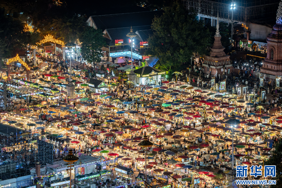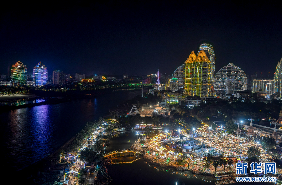 夜幕降临,伴随着上千家商铺的灯光逐一亮起,云南省西双版纳傣族自治州景洪市澜沧江畔的“网红打卡地”告庄西双景,迎来大量游客进入景区拍照打卡。