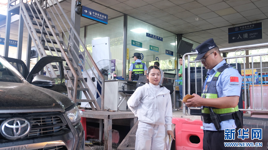 移民管理警察对入境人员进行检查(10月29日摄)。新华网发(黄远飞 摄)
