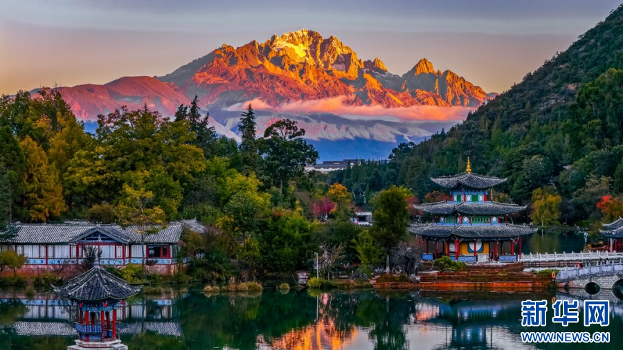 “日照金山”与黑龙潭的亭台楼阁相映成趣(11月16日摄)。新华网发(徐俊 摄)